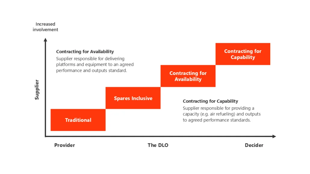 The different styles of contracting for industrial involvement in the through-life support of defence systems are referred to as Contractor Logistic Support or Performance Based Logistics. There are a set of different levels which are presented as a “Transformation Staircase” as shown in the figure below (taken from the UK Defence Industrial Strategy – Defence White Paper, 2005[5]).