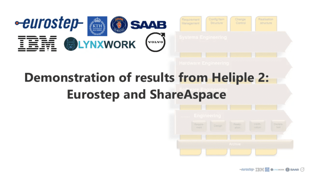 Welcome to the Heliple 2 research project results demonstration, showcasing Eurostep’s collaboration with key partners such as IBM, KTH, Linxwork, Saab Aeronautics, and Volvo Cars. This video presents a detailed scenario highlighting how an aircraft manufacturer (Prime) and an ADC supplier collaborate through various tools and methodologies for configuration management. Key highlights: This detailed demonstration […]