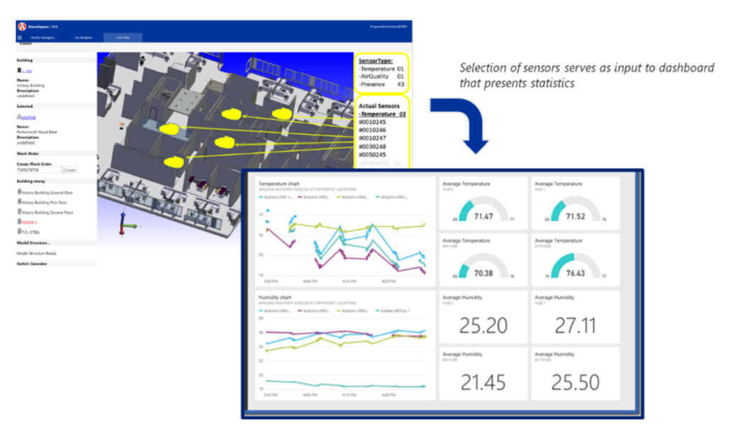 Once the sensor data builds the digital twin that is managed in ShareAspace, information can be aggregated. For example, temperature sensors emit values to the sensor digital twin which knows that it is serving a BIM space. The BIM space object can make inferences by analyzing data from the sensors that serve the space. It should be noted that the aggregated information can be deduced from different sensor types. For example, a zone object can have a property that is the result of combining different measures of air quality from different types of sensors.